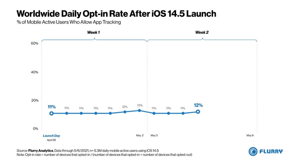 然而,應用程式分析機構 Flurry 統計,自 iOS 14.5 推出兩週以來,樣本數 530 萬的全球活躍用戶中僅有 12% 同意被 app 追蹤,北美數字更低,僅剩可憐的 4%。