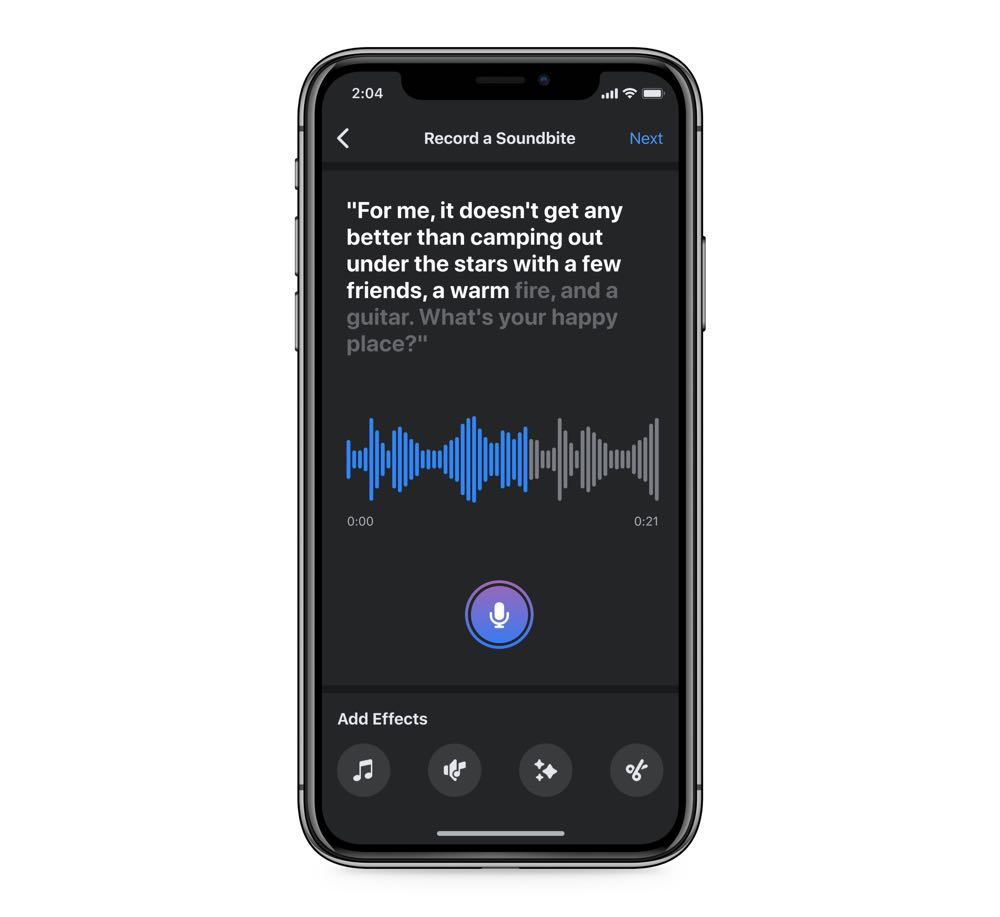 - Soundbites:Soundbites 是簡短又有創意的語音剪輯功能,方便用來記錄生活中的趣事、笑話、靈感、短詩等,並可分享在動態消息上。未來幾個月,Facebook 將與少部分的創作者展開 Soundbites 測試。