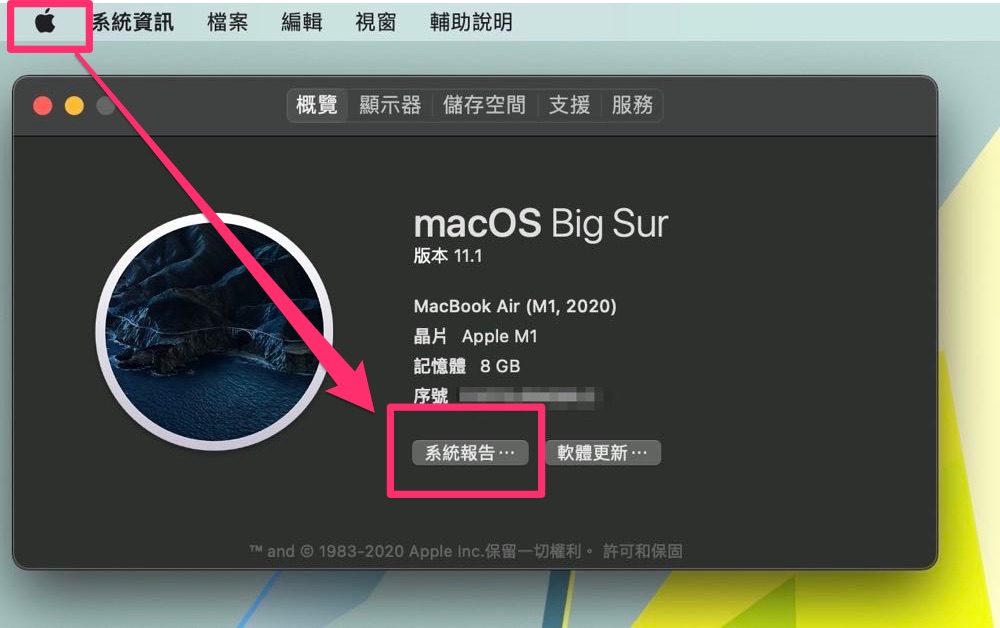 在桌面上的左上方選擇  圖示選項 >>> 「關於這台電腦」>>>「系統報告」 中從選單中找到「電源」,便會看到「健康狀態資訊」,裡面便有這台 MacBook 電池的循環次數以及電池的狀態。