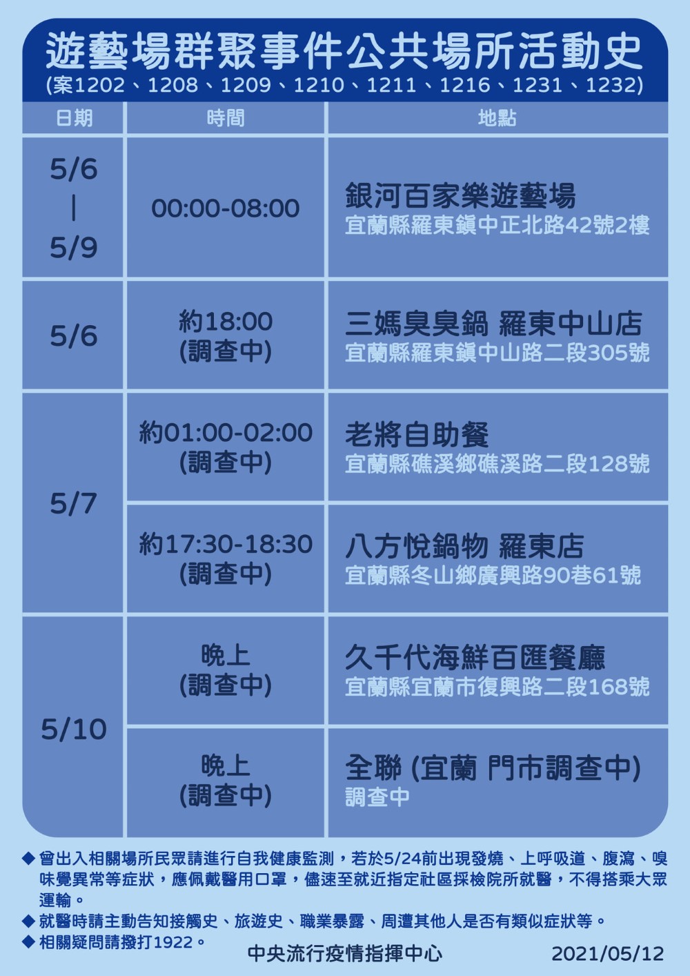 指揮中心今日公布「羅東銀河百家樂遊藝場群聚事件」公共場所活動史,呼籲民眾在 5 / 24 前出現疑似病症,記得配戴口罩前軮指定社區採檢所就醫,且不得搭大眾交通運輸工具: