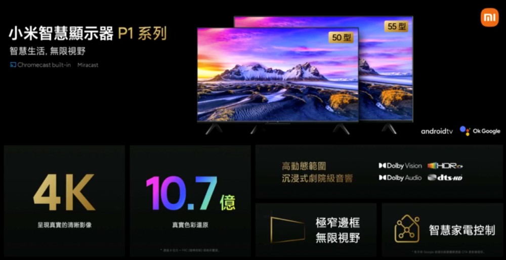 小米稍早公布「小米 11 Lite 5G」台灣上市消息,隨即又發表兩款 4K 智慧顯示器——小米智慧顯示器 P1系列,共有 55″ / 50″ 兩種尺寸,內建 Android TV 作業系統、支援 Google 語音助理,售價 15,999 元起。