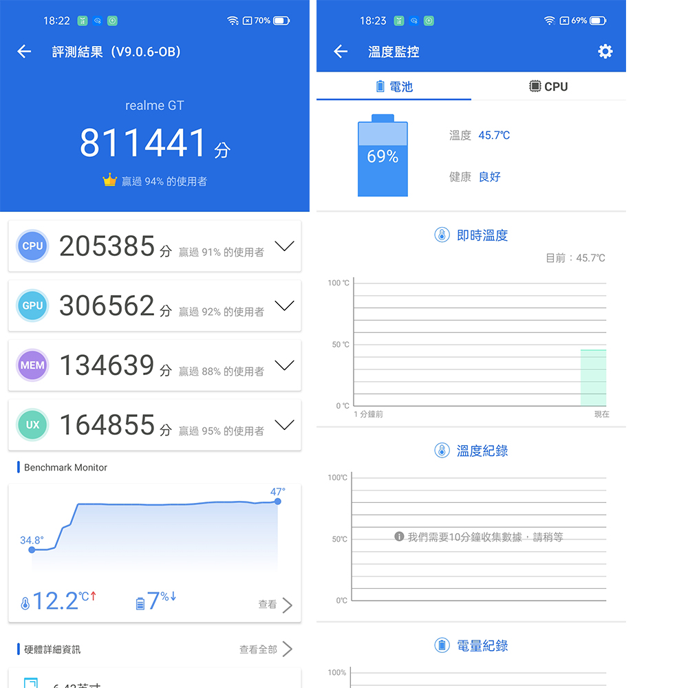藉由安兔兔來跑分,realme GT 均衡模式下總分 811441(CPU:205385 / GPU:306562 / MEM:134639 / UX:164855),排名第 8,以 GT 的價位來說成績算是相當不錯。在開啟 GT 模式下,CPU、GPU 火力全開,兩個項目的分數高於均衡模式,且無論是均衡還是 GT 模式,最高溫度皆維持在 47 度左右,機身溫度控制得宜。