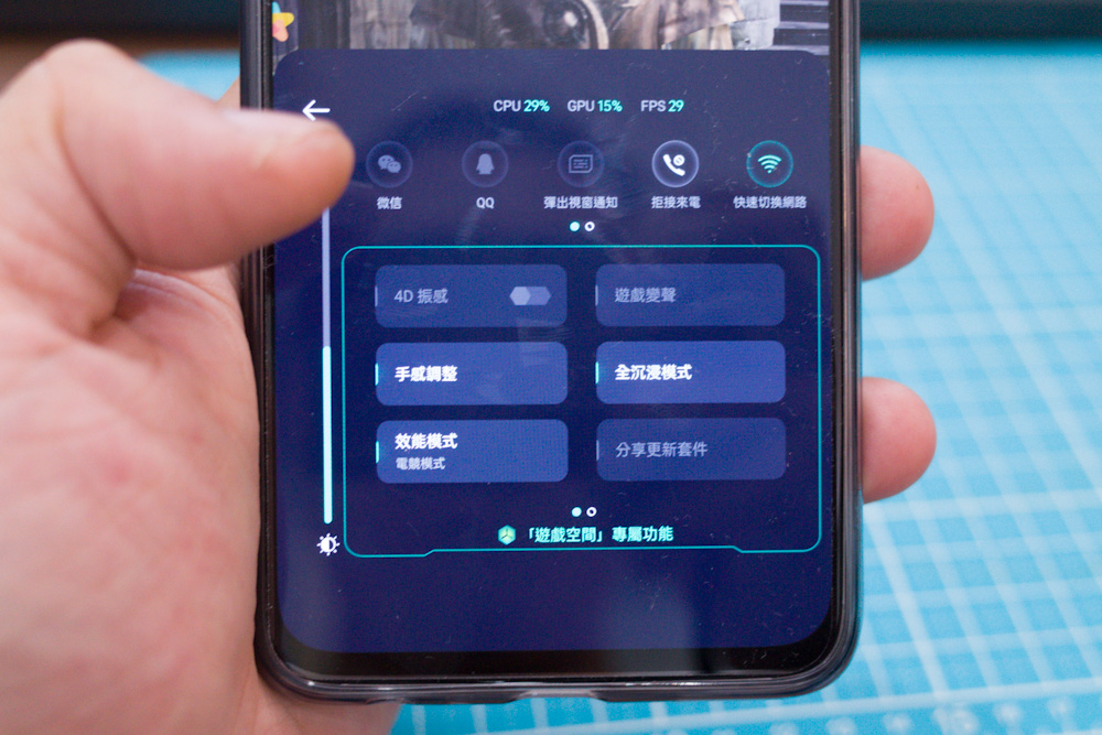 選單中也提供亮度鎖定、智慧調整解析度(降低解析度省電量)、遊戲變聲等實用功能。其中比較特別的是「4D 震感」,它類似 PS5 手把的功能,內建線性馬達會依照遊戲場景做出不同震動回饋,目前支援的遊戲不多,中國版本有《王者榮耀》。