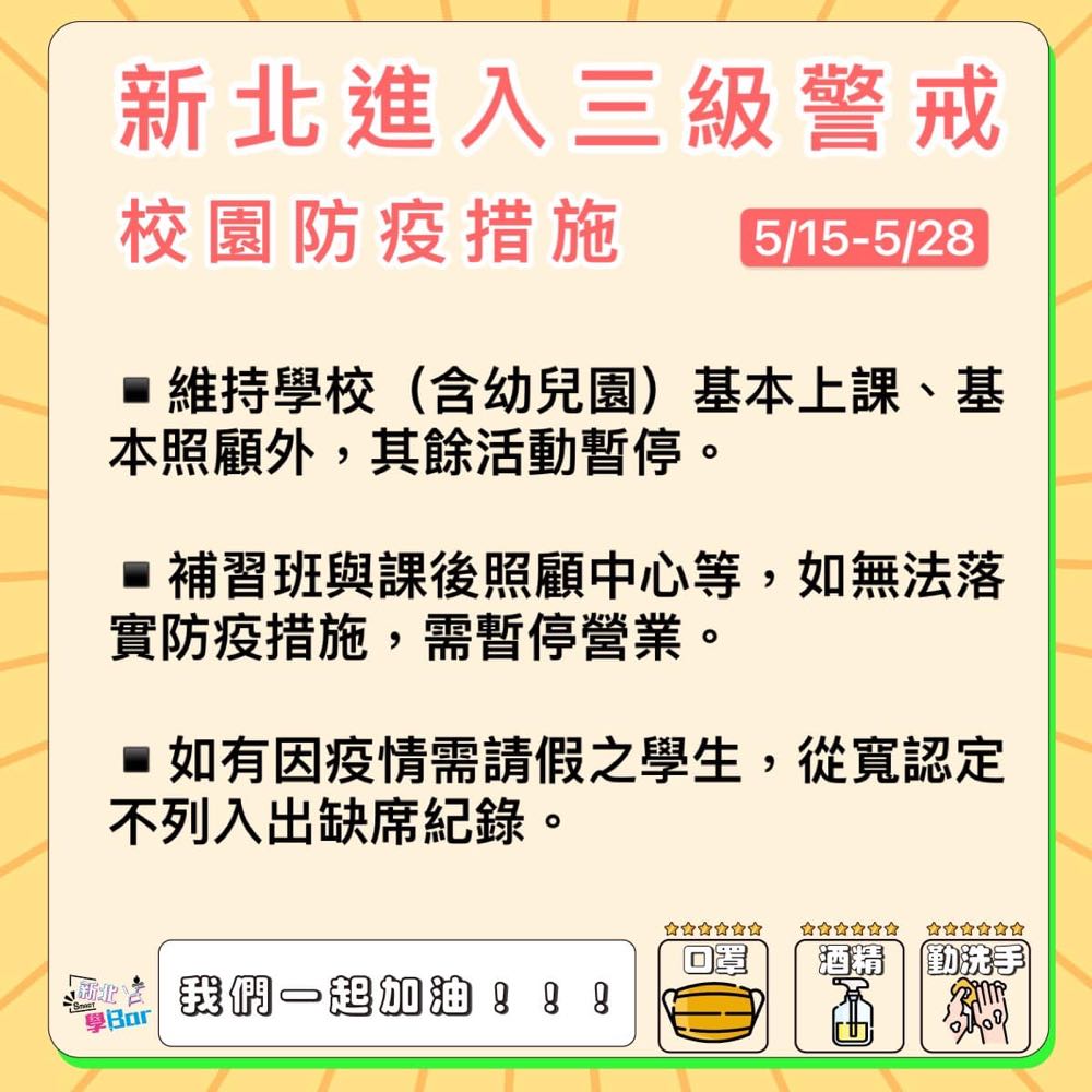根據新北教育局的公告,自即日起至 5 月 28 日校園中的正式課程、課後照顧與週三下午的實驗課程都會在落實防疫措施的前提下正常進行,課後社團活動則一律暫停。