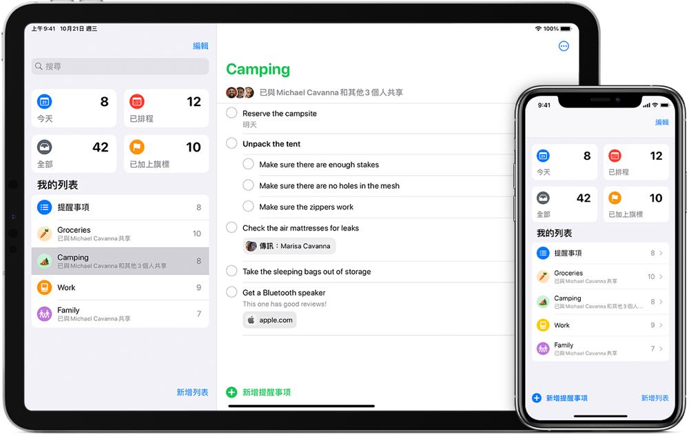 在家工作,或多或少也是一項專注力的挑戰。「提醒事項」app 能夠協助建立包含子任務和附件的提醒事項,並根據時間和地點設定提示,為每項工作設下時限,有助提升效率,也能與同事或家人共享一份「提醒事項」列表,當對方接受邀請後,便可加入、刪除和標示已完成的項目。無論是工作任務抑或購物清單,不同範疇的待辦事項都一目了然。