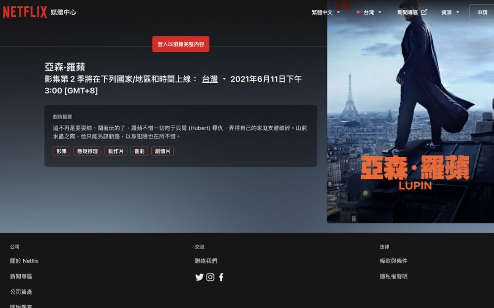 倘若我們查詢 6 月即將上映的新片,對其中的某部作品感到興趣,例如「亞森羅蘋 第 2 季」,只要點下就能看到即將在台灣上片的時間!