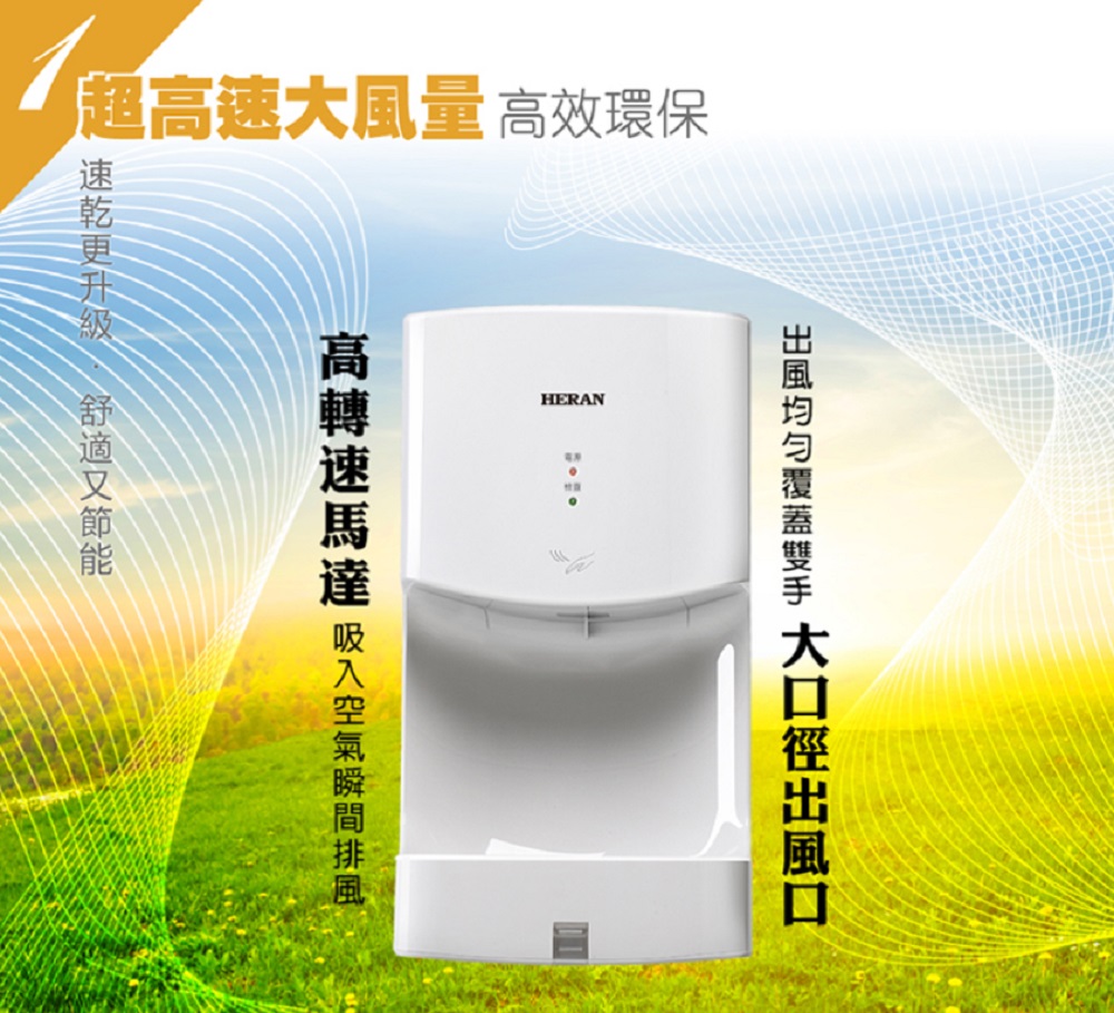 HERAN 禾聯自動感應烘手機具有大口徑出風口設計,內建的高轉速馬達能將吸入的空氣快速排出,可大面積、快速的吹乾雙手上的水珠。此外,它的體積比洗手間常見的烘手機還要小很多,即使是家中洗手機、公司茶水間都可以擺放,在疫情不斷升溫的期間可加強手部清潔的效果。