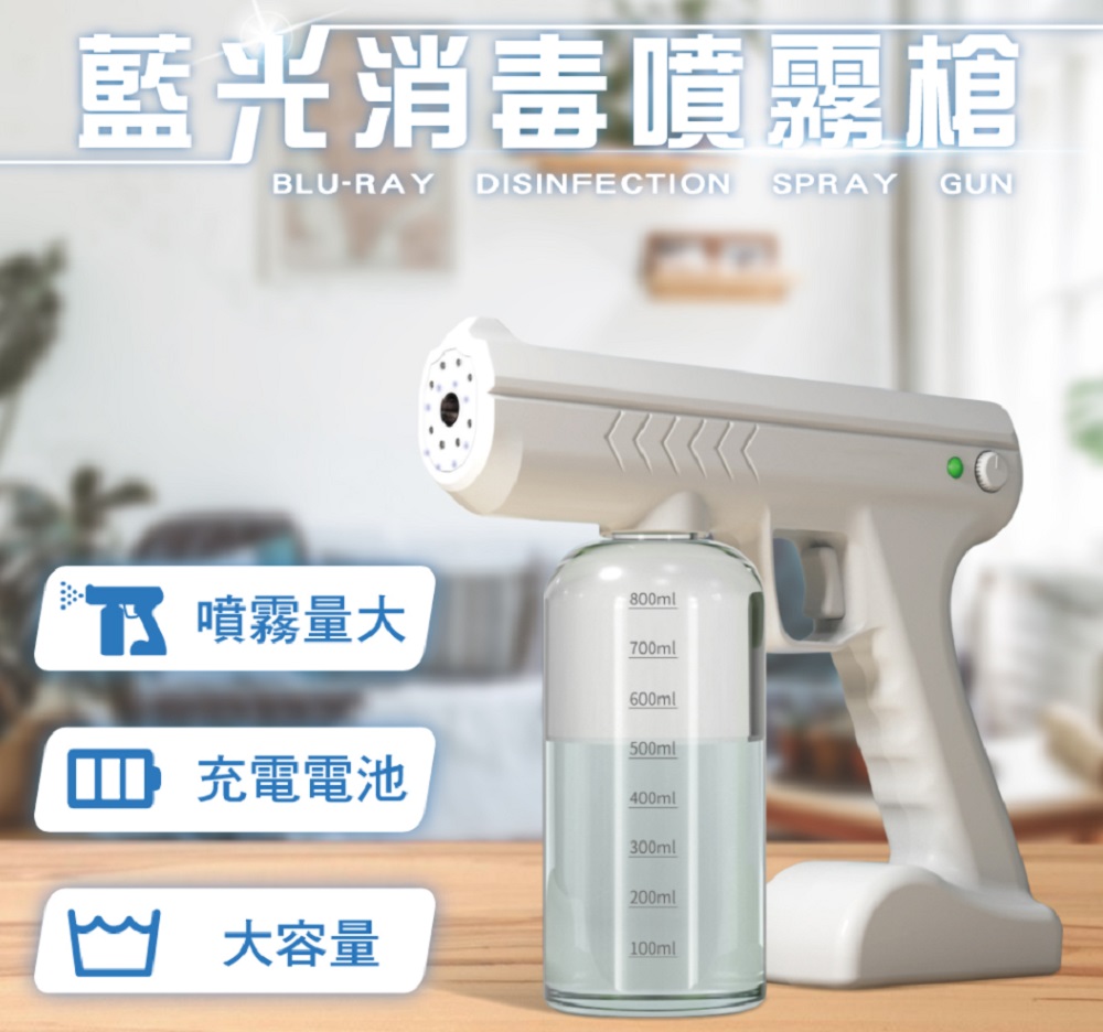 購這次要介紹的「藍光消毒噴霧槍」來進行環境消毒。這款藍光消毒噴霧槍與一般的噴霧槍較不同的是,它的體積相當迷你,再加上可以充電的特性,隨身攜帶到處消毒都非常方便。另外,槍口八個藍光發射器可以讓藍光的照射範圍更廣,消毒殺菌可以一次搞定。