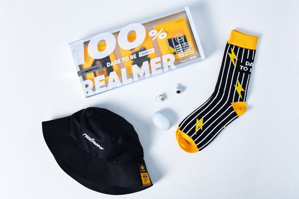 秉持潮玩精神的 realme 繼去年推出 realmeow 跨足公仔圈後,此次再度不按牌理出牌一腳踏入穿搭領域,推出獨家 realme 聽我的限定禮盒,以透明霧感的精裝外盒,搭配品牌主張 Dare to Be realme 字樣進行點綴,透視巧思使黃色內包裝一覽無遺,潮流感翻倍!禮盒內品項包含市場夯品 realme Buds Air 2 Neo 和兩項全新穿搭周邊,分別為極具街頭態度的 realmeow 漁夫帽和怎麼搭都有型的黃黑相間 realmeow 長襪,穿戴上身既隨意又張揚,立即釋放你的潮玩自信。