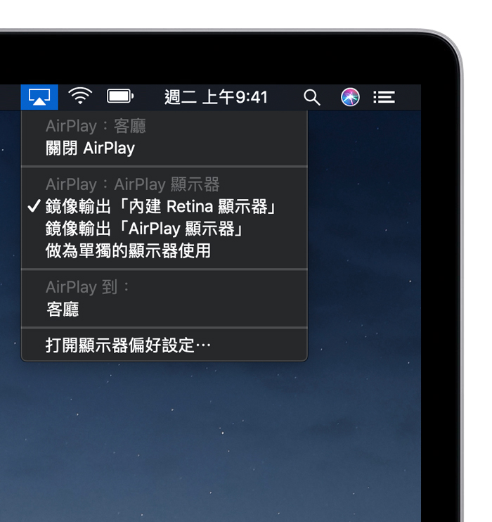 2. 在 Mac 上,按一下螢幕頂端選單列中的螢幕投射符號。如果沒看見,就從「蘋果」()選單 >「系統偏好設定」>「顯示器」,然後選取「在選單列中顯示鏡像輸出選項(可用時)」。