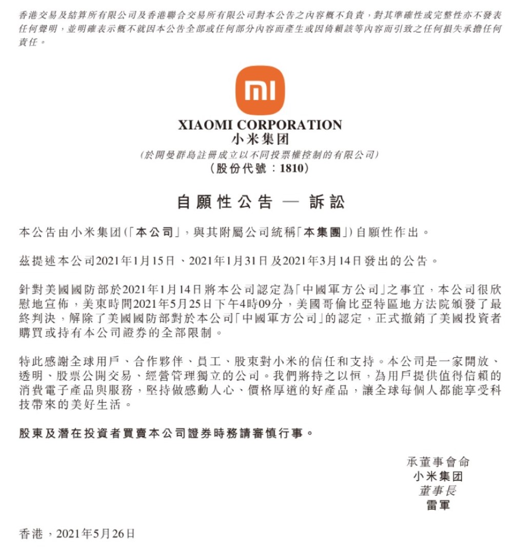 「針對美國國防部於 2021 年 1 月 14 日將小米集團(下稱”本公司”) 認定為『中國軍方公司』之事宜,本公司很欣慰地宣佈,於美東時間 2021年 5 月 25 日下午 4 時 09 分,美國哥倫比亞特區地方法院頒佈了最終判決,解除了美國國防部對於本公司「中國軍方公司」的認定,正式撤銷美國投資者購買或持有本公司證券的全部限制。