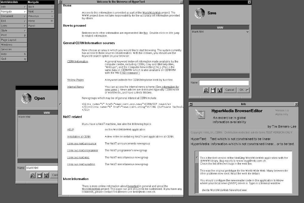 (全球第一個瀏覽器 WorldWideWeb 的樣貌 / 此為 CERN 為慶祝瀏覽器 30 週年開發的網頁模擬器)