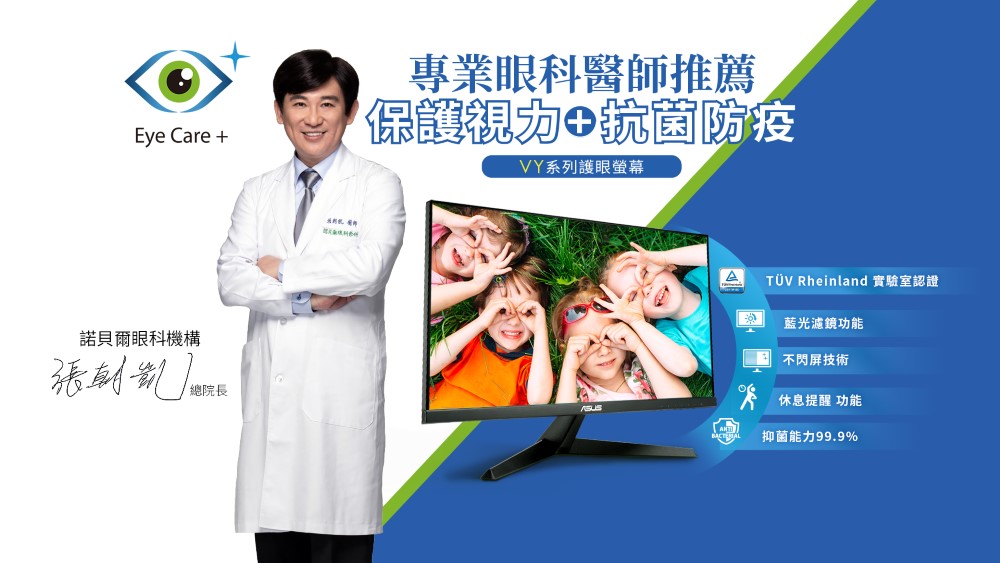 諾貝爾眼科機構總院長張朝凱專業推薦:「眼部病變趨勢年輕化,與用眼時間拉長有關。華碩抗菌護眼螢幕擁有低藍光認證、休息提醒等功能,可降低有害藍光,保護疲勞雙眼,避免產生電腦視覺症候群(CVS),維護靈魂之窗的健康。」
