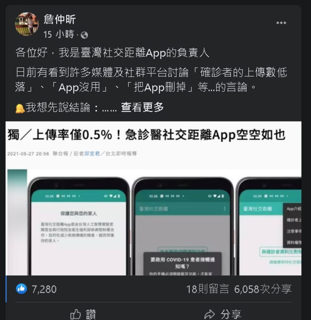 」等言論。擔憂負面言論可能削弱 App 的接觸通知功能,臺灣社交距離 App 負責人詹仲昕 5 月 30 日透過臉書貼文予以回應(貼文連結),他表示,近期將有大量確診上傳,呼籲大眾勿輕易刪除 App,否則過去 14 天紀錄將一併被刪除。