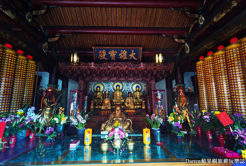 ▲大雄寶殿中龕奉祀三世佛釋迦牟尼佛、藥師佛、阿彌陀佛,陪祀觀音世菩薩、大勢至菩薩、彌勒佛