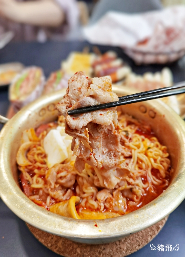 在這裡的部隊鍋是個人鍋喔,實在太貼心了啦!重口味微辣湯底,配上豬五花、德國香腸、年糕….配料多樣,