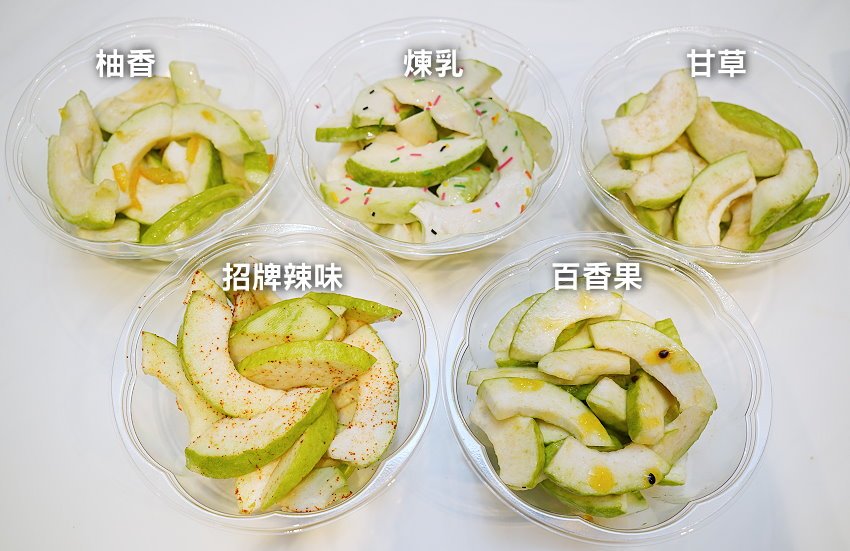 ▼甘草芭樂的用料很實在,每一塊都有均勻沾附到調味料,吃起來都很夠味!尤其他們家的甘草粉是採用中藥材下去調製而成,老闆還特別拿給我們聞了一下,沒有什麼化學的味道,只有純粹甘草的清香,真的很可以~~吃起來帶點鹹甜甘醇的滋味,加上切成薄片、剛剛好的厚度,每一口的味道都很豐盈飽滿!其他口味也都是以甘草粉當作基底,再加上其他醬料調味而成,吃起來味蕾都非常和諧開胃,當天吃到的每一款都好吃不誇張!