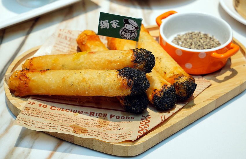 ▼蟹肉創意雪茄卷,裡頭包裹蟹肉、蝦泥等配料,油炸至金黃酥脆並以芝麻粉點綴,遠遠看起來真的很像雪茄無誤(蓋章)!吃起來外酥脆內香Q,還帶有鮮美口感與濃濃海味,單吃就很夠味~~重口味的朋友也可以沾附一旁的胡椒鹽提味,香氣更噴發!