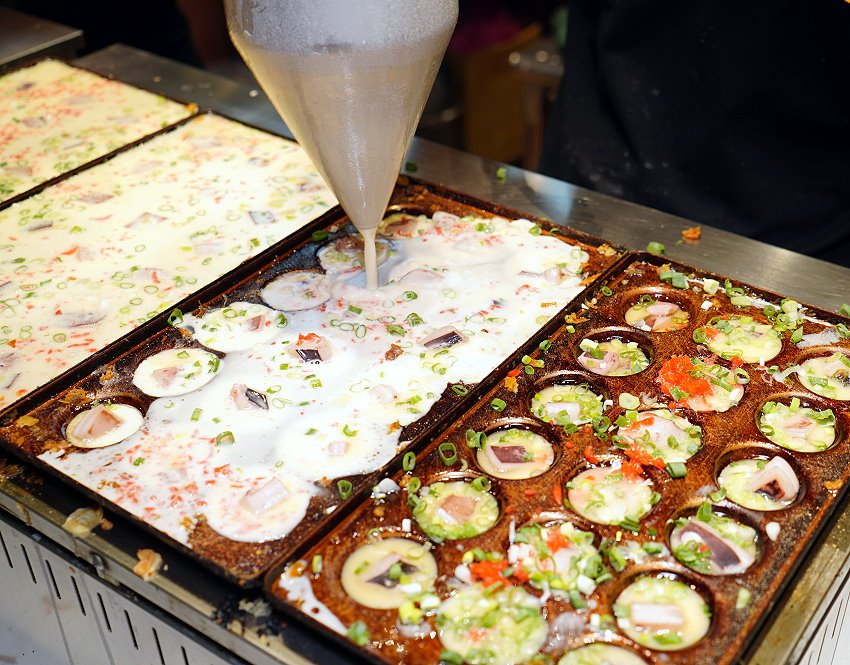 ▼裡頭放上大塊的章魚、蔥花等配料,再淋上特調麵糊,就是正宗的日本章魚燒!