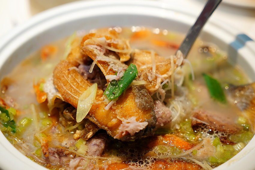 ▼鯧魚米粉,這道算是台菜中的經典,也是店內人氣超旺的餐點之一!湯頭先放入芋頭一起熬煮,等到芋頭化開後再放芋頭塊下去,喝起來鮮甜又帶有芋頭、紅蔥頭、芹菜的香氣,加上微微胡椒更是畫龍點睛;酥炸過的黃金鯧吃起來肉質紮實香嫩,微酥又帶點濕潤口感,吸附滿滿湯頭精華後更加鮮美好吃!
