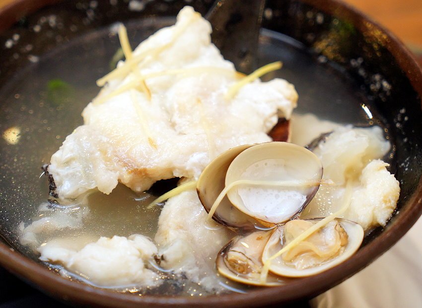 ▼龍膽魚片湯,裡頭的龍膽魚片給得相當大器,吃起來香嫩又帶點Q度,加上蛤蜊提鮮更增添鮮甜美味,湯頭也超級鮮美好喝!