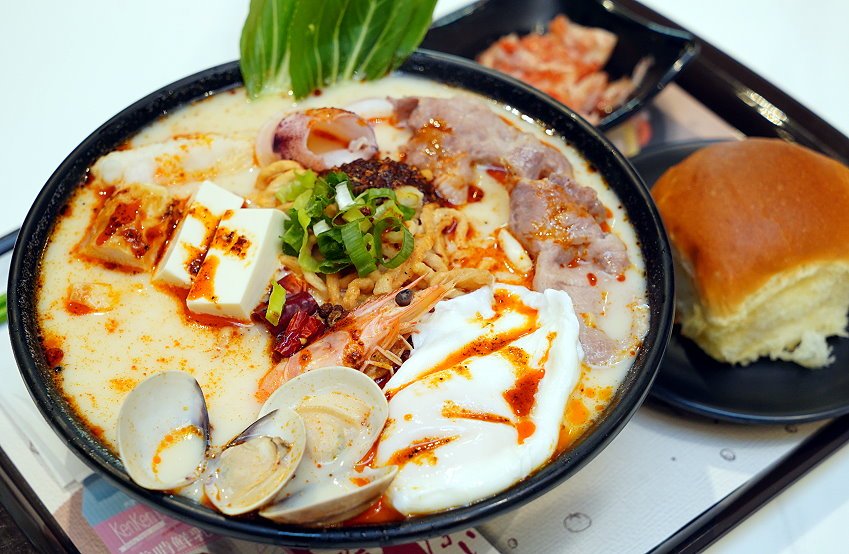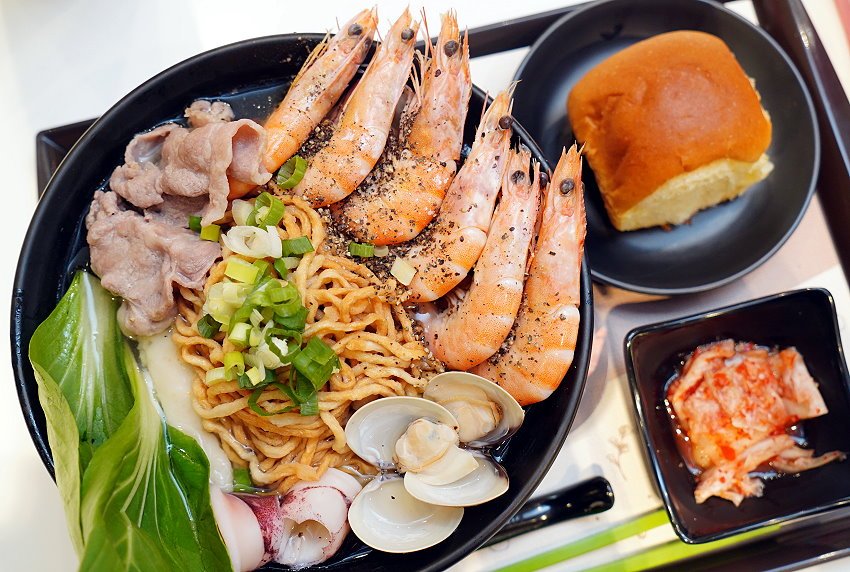 ▼黑胡椒蝦蝦+牛肉,不僅霸氣的附上六隻大蝦,而且還有蛤蜊、小卷、牛肉片、蔬菜、豆腐等配料,湯頭喝起來清甜鮮美又帶有胡椒香氣,搭配我們最愛的鍋燒麵真是絕配!一旁還有附上餐包、泡菜,讓大家當作附餐、開胃小菜食用,吃完真的挺有飽足感!