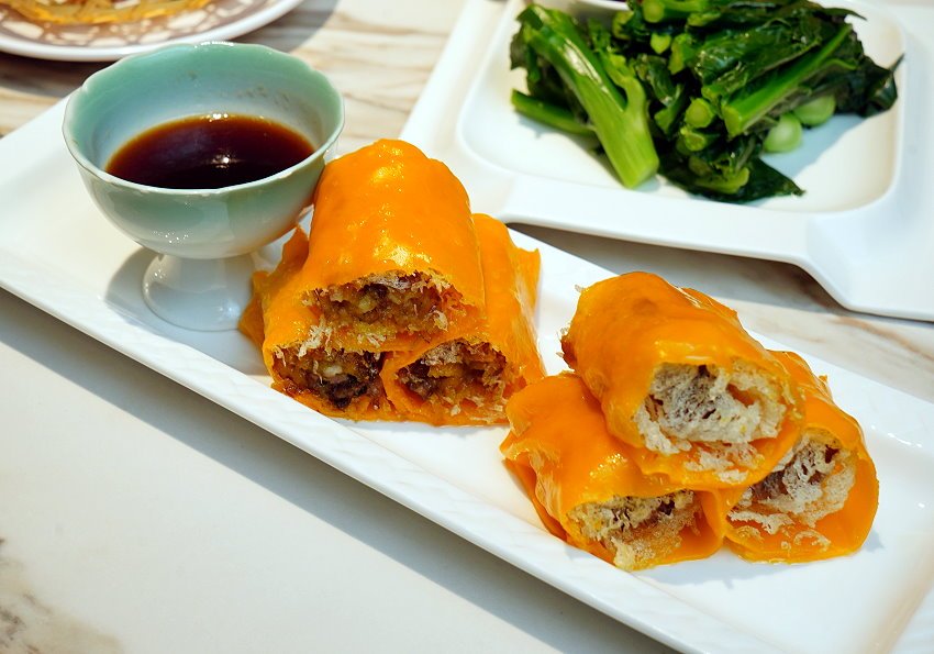 ▼脆皮金瓜腸粉,這道也是義享店獨家販售,以南瓜製成的腸粉帶有討喜的亮橘色,一口咬下外Q內酥,還帶有南瓜泥的清甜,口感非常多元,搭配醬料更是提味不少~~而且完全吃不出來是蔬食料理,推薦必點!