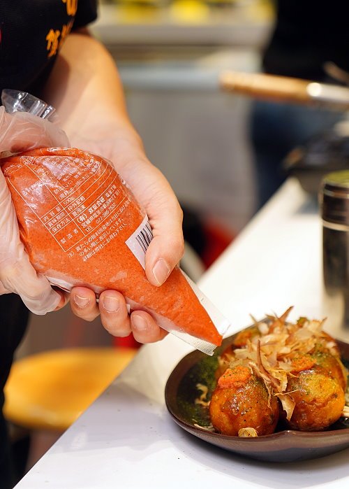 ▼因為日本章魚燒的外皮原本就是屬於比較軟的口感,賀穀章魚燒之前也是如此做法,但後來有調整成台灣人比較喜愛的微酥口感,口味也因應台灣人需求增加更多品項,讓大家能吃得更過癮!章魚燒本體就很美味了,加上各種調味更增添風味層次,每一種都好吃耶~~辣味有點類似七味粉的口感,微微辛香味也很合拍!