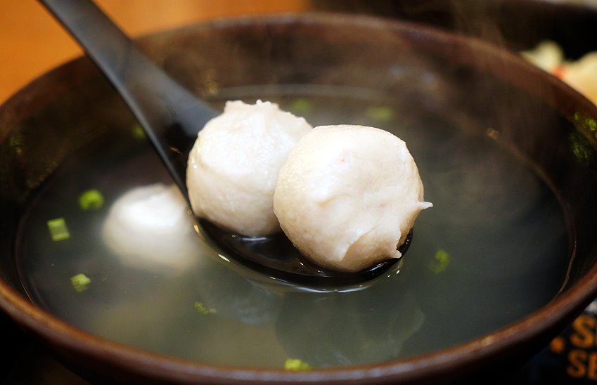 ▼鱈魚湯包丸湯,裡頭一顆顆渾圓可愛的鱈魚湯包丸是店家自製的,採用鱈魚漿包裹滿滿的肉餡,一口咬開要小心爆漿唷!