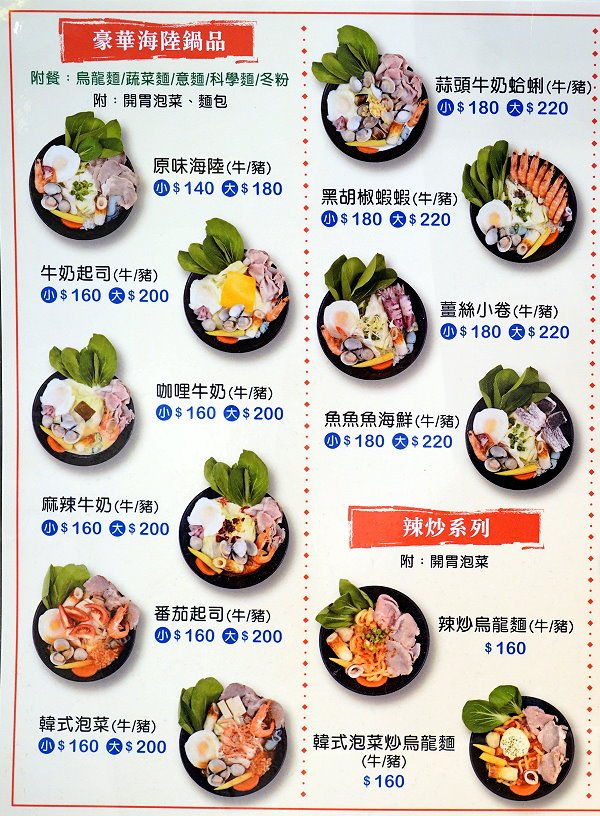 ▼菜單,裡頭有多達數十種豪華海陸鍋燒,每道鍋品都可以選擇大小份,算是滿貼心的!