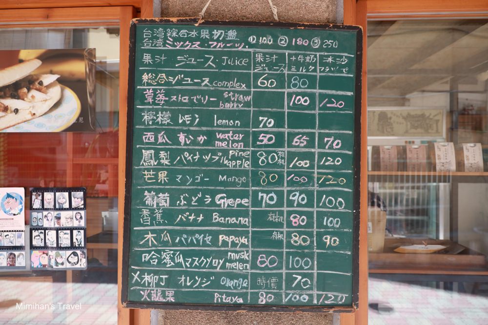 旭峰號僾鮮果的價目表給大家參考,有很多種不同水果可以選擇,這天看到菜單上還寫著日文,一時興起上網搜尋更發現旭峰號被日本不少台灣相關旅遊雜誌媒體報導過,是風靡日本的台南景點唷!要不是現在疫情影響,感覺應該也可以遇到不少櫻花妹