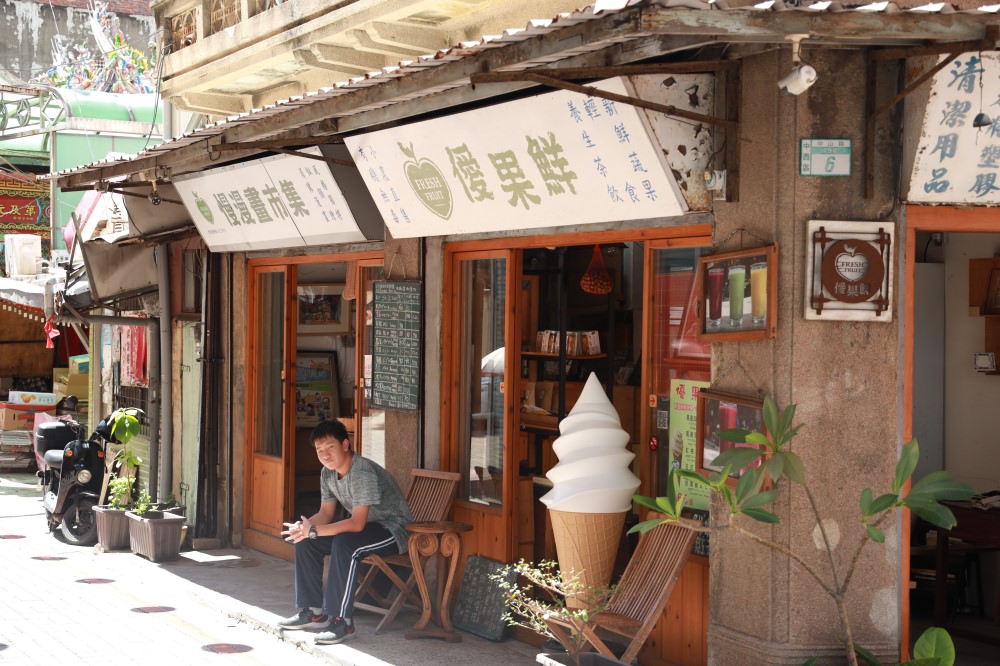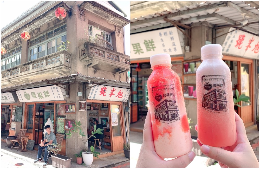 早期是經營不銹鋼鋁器、陶瓷器、熱水瓶塑膠、清潔用品的五金百貨,而現在的僾鮮果則是專賣無毒蔬果、水果切盤、果汁冰沙⋯等,連招牌都刻意仿古製作,完整保留了旭峰號老屋原有的面貌。