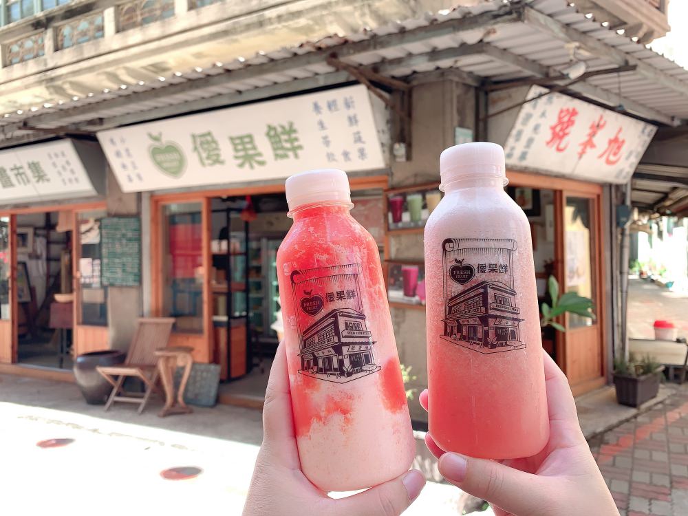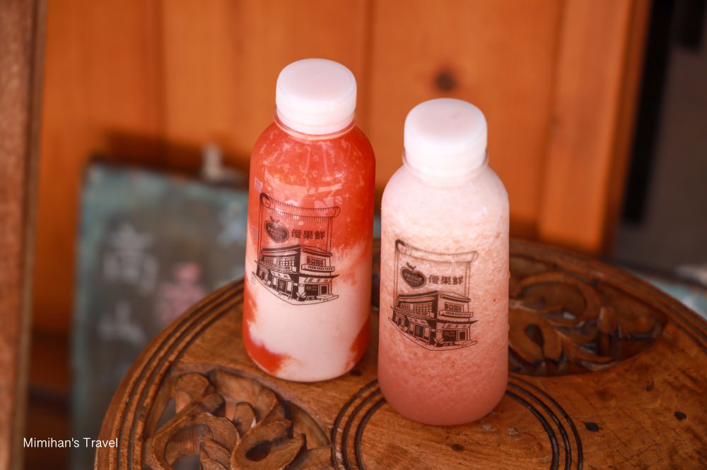 我點了綜合果汁和木瓜牛奶,喝起來真材實料清涼又消暑,外帶的瓶子也頗可愛,上面還印著旭峰號僾鮮果的圖樣呢!