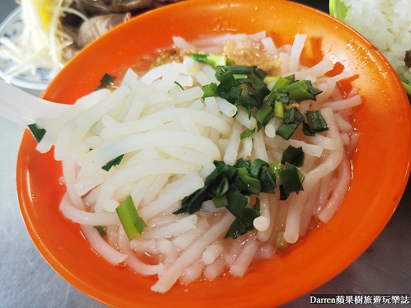 米粉湯小碗15元大碗25元,店家的動作非常快,沒有等多久就通通上桌,米粉湯上面有韭菜和油蔥酥,灑點胡椒粉會比較好吃,米粉吸收大骨湯頭,滿滿的米粉大口吃下去口感Q嫩,這一碗絕對可以讓你一餐很粗飽