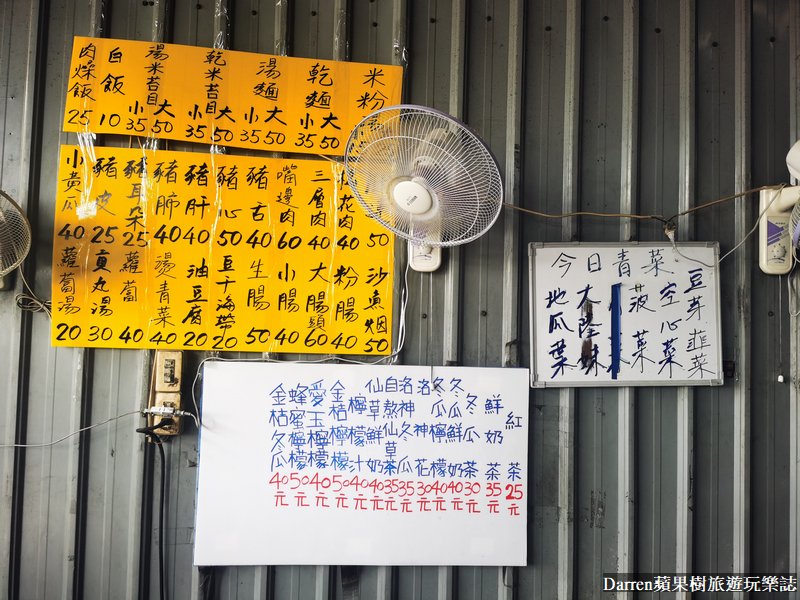 大有路鐵皮屋米粉湯菜單MENU,就在牆面上價格很平價,有米粉湯、乾麵、米苔目、肉燥飯以及許多黑白切,我來吃過幾次都是點米苔目或乾麵居多
