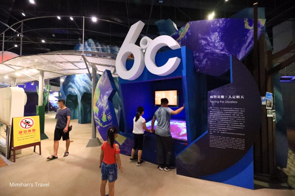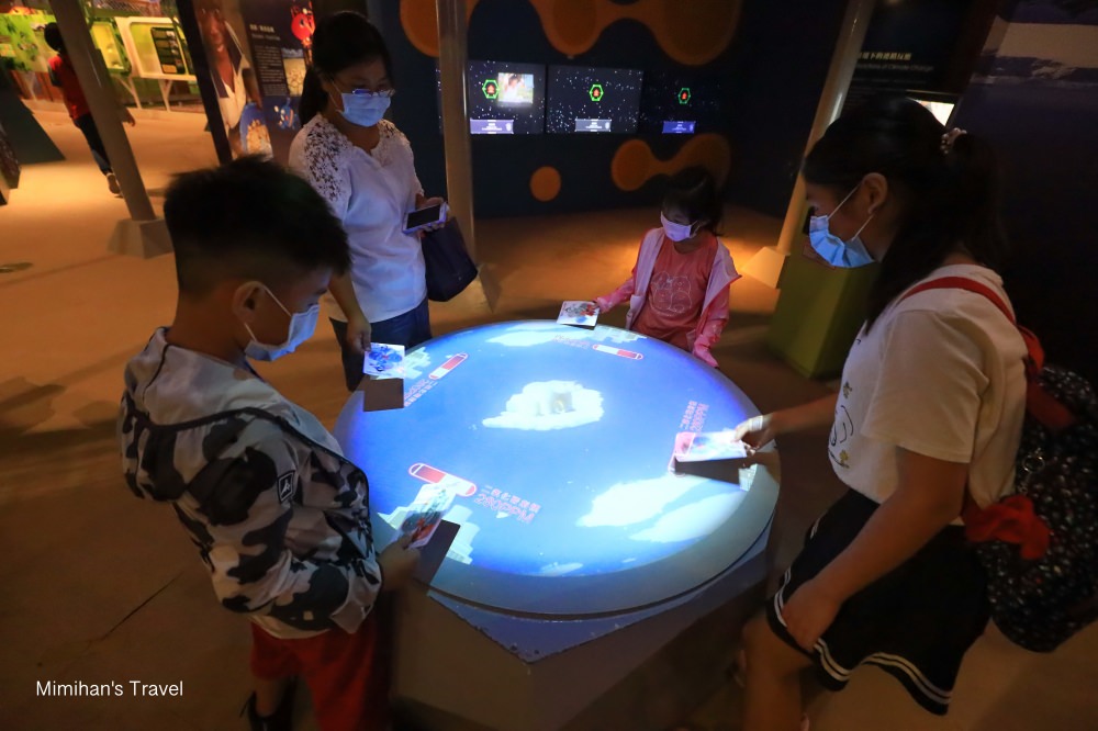 其中這次兄妹倆最有興趣的是氣候變遷館,裡面探討地球暖化、極端氣候災難的部分,我想可能是近期的包含新冠疫情、澳洲野火、中國水災⋯等災害頻傳,讓他們對於這樣的議題頗有感覺,有不少有趣互動裝置,還可以集點免費搭空中腳踏車。