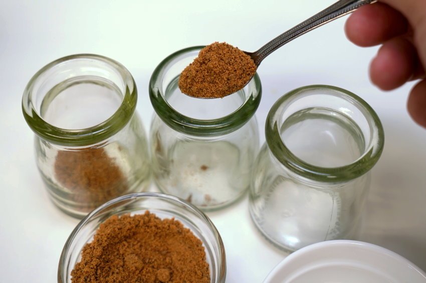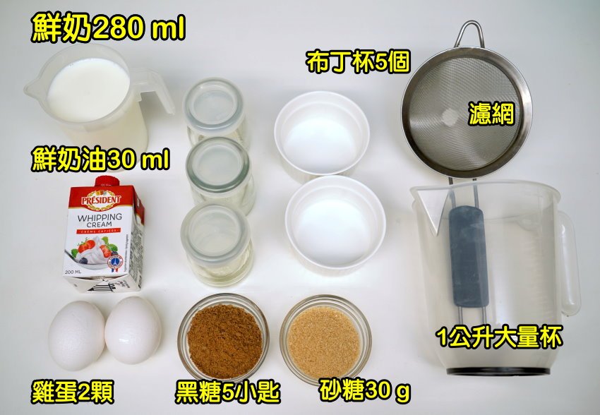 鮮奶 280ml、雞蛋2顆、鮮奶油30 ml、砂糖 30g (布丁液用)、黑糖 5小匙 (放在布丁底部用)