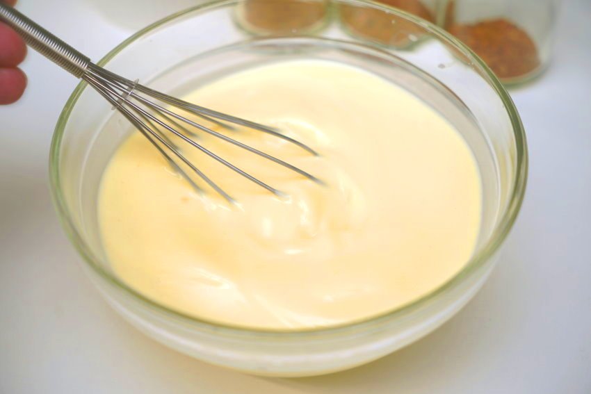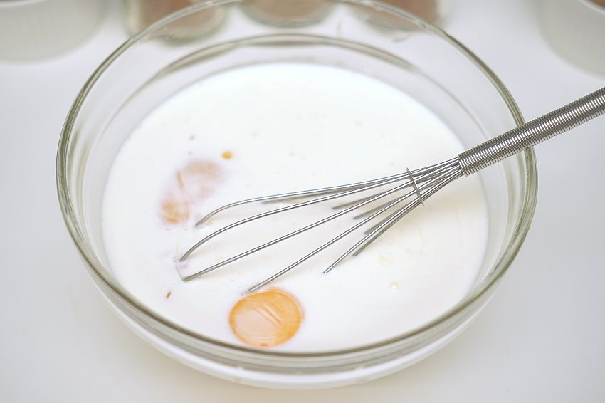 2.將鮮奶、砂糖、鮮奶油、雞蛋放到大碗中攪拌均勻。(如擔心砂糖無法完全融化,可以稍微將鮮奶微波加溫,先讓鮮奶與砂糖混合攪拌)