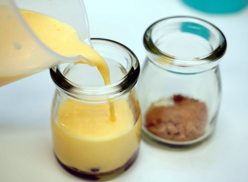 ▼將布丁液緩緩倒入杯中,也可以將布丁杯拿45度來倒,底部的黑糖比較不會被沖起來(如果黑糖被沖起來沒關係,等等也會慢慢沉下去)。