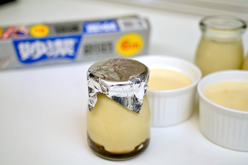 ▼如果你是用電鍋來蒸,最好蓋上一層鋁箔紙,因為蒸布丁時,電鍋鍋蓋將會有一些水滴滴下來,若是滴到杯中布丁會醜掉,水若是太多進去也會影響熟度還有保存時間。