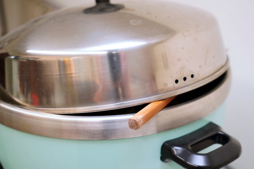 ▼電鍋倒入2碗水(蒸約20~30分鐘),拿一支竹筷子將鍋蓋留一個縫來蒸,這樣的做法主要是要防止電鍋火力太大,若是沒有開一個縫,布丁很容易過熱過熟,不僅口感會太硬太差,布丁內外都會有滿滿的氣泡孔,賣相就不太好看啦~
