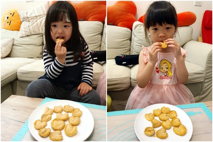 ▼雖然我們只有簡單對折兩次,但做出來的蝴蝶酥仍然非常飽滿,形狀也很像愛心,小朋友都很喜歡!