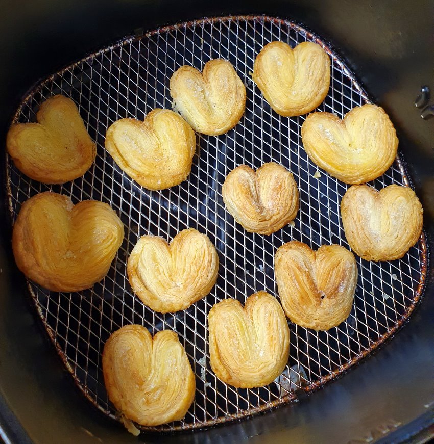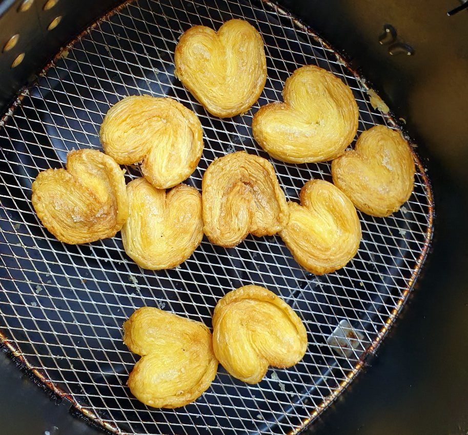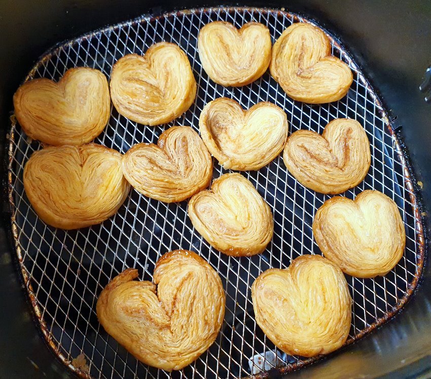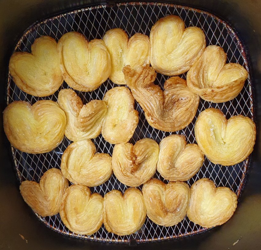 ▼第二次有學聰明一點,稍微放少一點~~距離遠一點,成品就好看很多!因為酥皮太輕的關係,氣炸過程中蝴蝶酥還會在裡頭跳舞,所以氣炸完呈現散亂的模樣是很正常的(笑)!