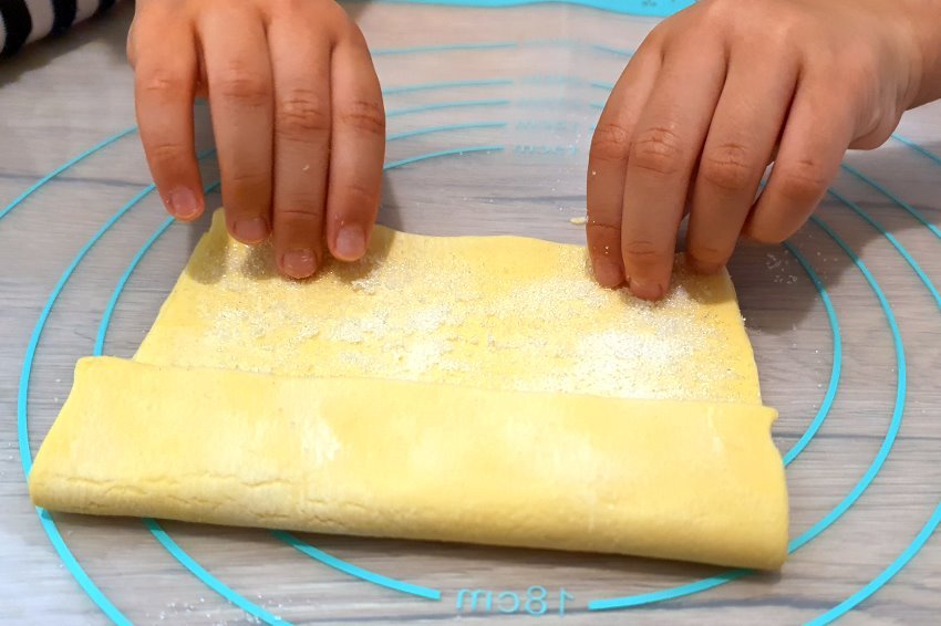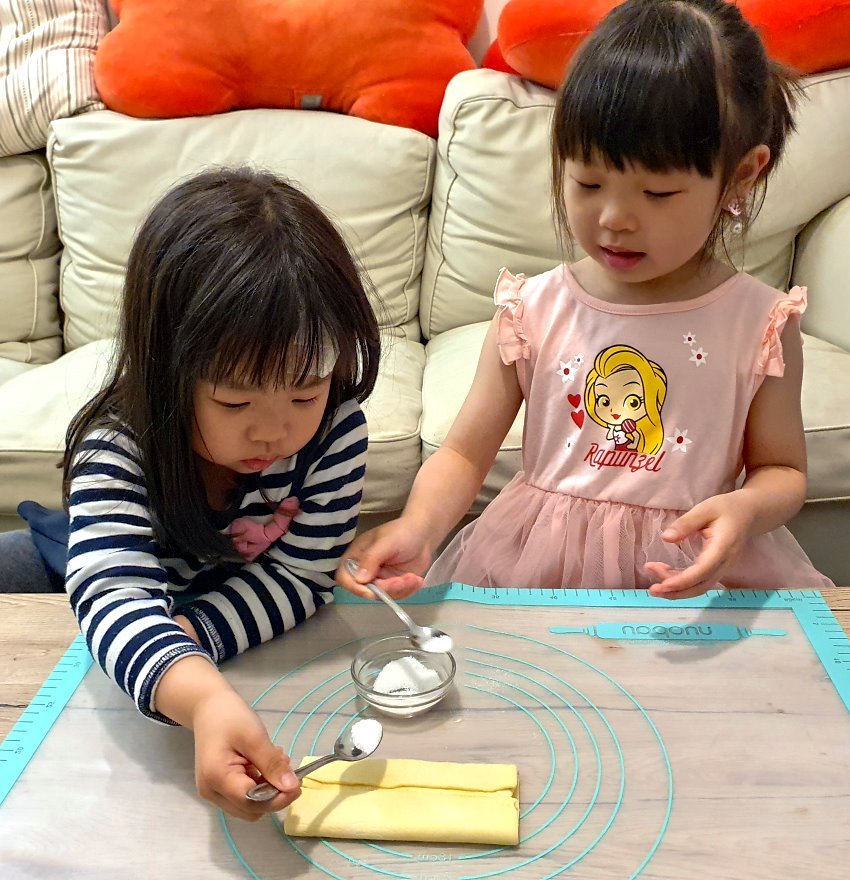 ▼真的超級簡單吧~~連小倆口都可以自行操作(笑)!接著再均勻撒上砂糖,就可以進行最後一次對折了!