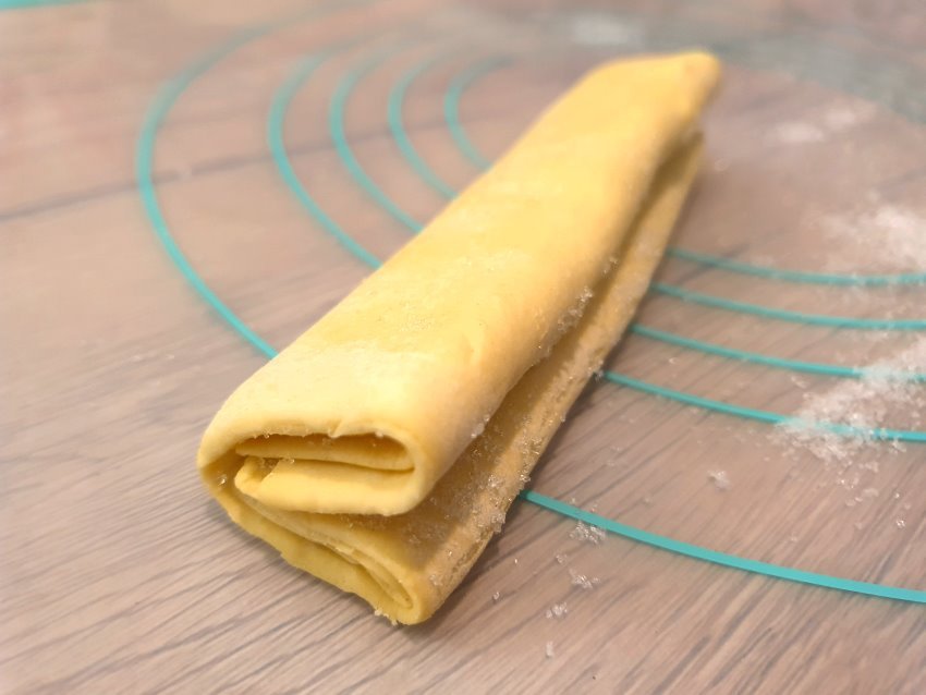 4.最後再整個對折即可,就可以開始切成薄段,兩片起酥片約可做成8~10個蝴蝶酥餅