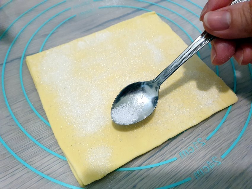 ▼做法也超級簡單,兩片起酥片先放置室溫回溫5~10分鐘變軟後,就可以開始製作了,一開始先均勻撒上砂糖,再來就是準備對折囉!