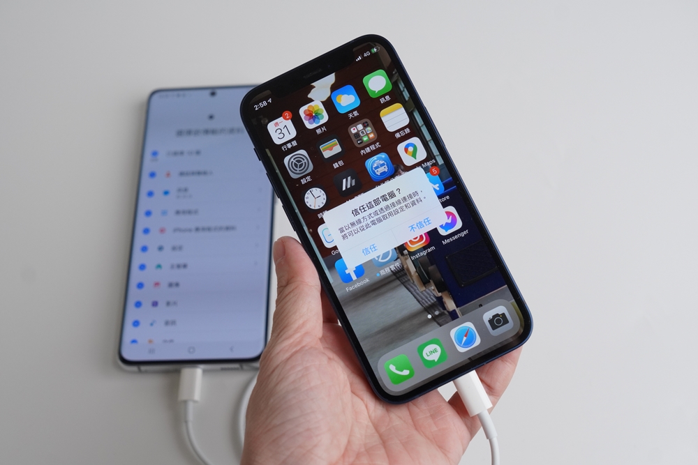 STEP 2:將 Lighting 對 Type-C 傳輸線分別接在 iPhone 以及 Galaxy S21 Ultra 5G 上,並按下 iPhone 上的「信任」這部電腦。