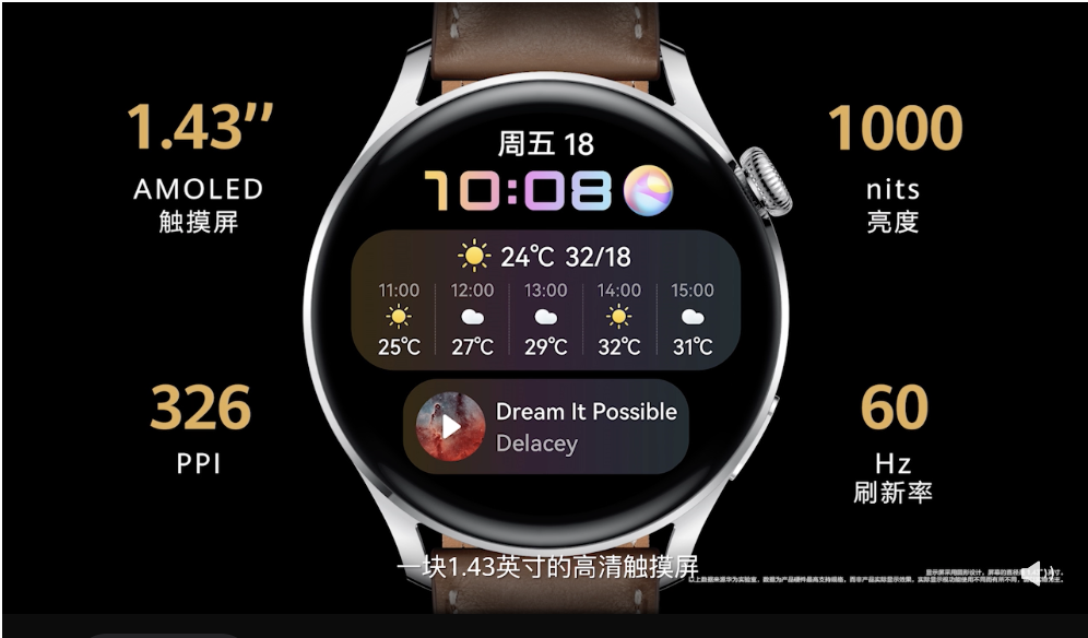 相較於 2017 年的 WATCH 2,時隔了 4 年所帶來的 HUAWEI WATCH 3,有著 1.43 吋 466x 466 解析度螢幕、60Hz 螢幕更新率。3D 不銹鋼錶冠和可更換式錶帶,更加入了 eSIM 的獨立通話能力。