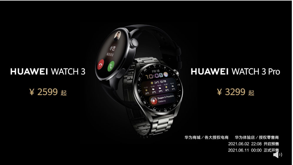 HUAWEI WATCH 3 售價人民幣 2,599 元( 約 NT12,3(00)起、HUAWEI WATCH 3 Pro 售價 人民幣 3,299 元(約 NT15,000) 起,今天起開放預購!