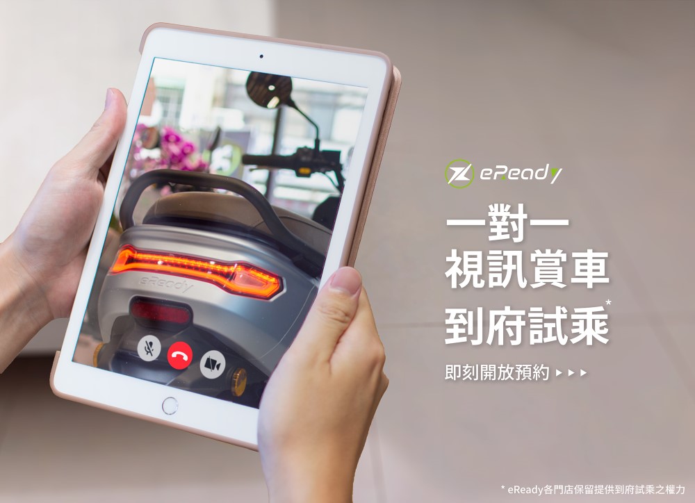 即日起,eReady「視訊賞車」、「到府試乘」正式上線。民眾可在全臺 eReady 門市 LINE 官方帳號、FB 粉絲專頁預約服務。若預約「視訊賞車」,門市人員會透過文字、圖片及視訊等方式,向消費者介紹 eReady 車款,想要實際感受車款魅力,也能直接 與店家申請到府試乘。
